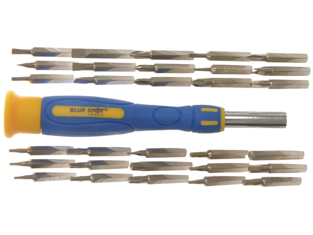31-piece precision bit driver set. The bits are made from chrome vanadium and have a nickel finish.
