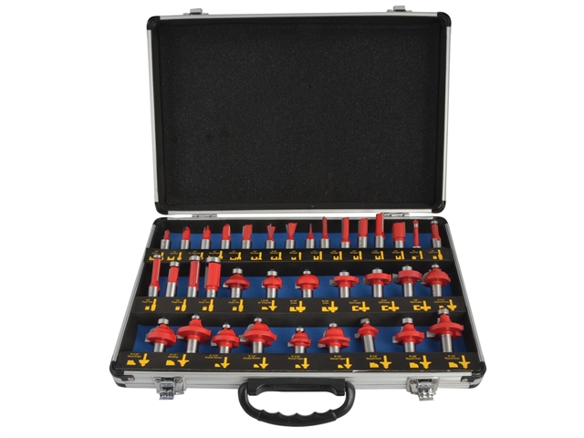 1 x Straight Cutter (3.2/14mm)1 x Straight Cutter (6.5/20mm)1 x Straight Cutter (10/25mm)1 x Straight Cutter (12.7/20mm)1 x Straight Cutter (12.7/25mm)1 x Straight Cutter (19/20mm)1 x Dovetail Cutter (12.7/8mm)1 x Dovetail Cutter (15.0/12mm)1 x Panel Pilot (6.5/30mm)1 x Guided Flush Trimmer (10/13mm)1 x Guided Flush Trimmer (10/25mm)1 x Guided Flush Trimmer (12.7/12mm)1 x Guided Flush Trimmer (12.7/25mm)1 x Guided Flush Trimmer (19.1/25mm)1 x Mortising Cutter (12.7/13mm)1 x Core Box R 3.2mm (7/6mm)1 x Core Box R 6.3mm (12.7/8mm)1 x Core Box R 6.3mm (12.7/20mm)1 x 90° V groove cutter (12.7/10mm)1 x 45° Guided Chamfer (30/14mm)1 x Guided Cove R 6.35mm (25/10mm)1 x Guided Cove R 9.5mm (30/14mm)1 x Guided Rabbeting Cutter (30/6.5mm)1 x Guided Rabbeting Cutter (30/8mm)1 x Guided Rabbeting Cutter (30/10mm)1 x Guided Classical Cove R 8mm (30/15mm)1 x Guided Wave Edge (30/18mm)1 x Guided Beading R 12.7mm (37/20mm)1 x Guided Double Roman (32/14mm)1 x Guided Double Roman (36/19mm)1 x Guided Roman Ogee (25/12mm)1 x Guided Roman Ogee (36/16mm)1 x Guided Rounding R 6.5mm (25/12mm)1 x Guided Rounding R 10mm (32/16mm)1 x Guided Rounding 12.7mm (36/20mm)