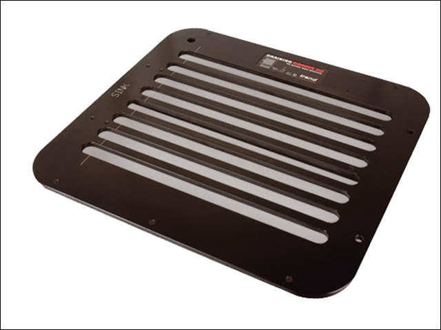 The Trend Draining Groove Jig is perfect for routing draining grooves in solid timber for Belfast type sinks. Made from 12mm hardwearing CNC machined phenolic. It provides a 0.5° fall with grooves at 50mm pitch and 455mm long. With sight marks for lining up and three removable sloping runners for support. There is also a cutter diameter check hole and fixing holes for user made stops for repetitious work.